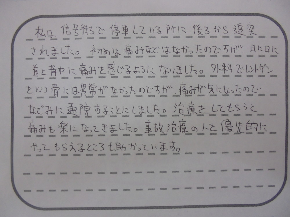 『私は信号待ちで、停車している所に後ろから追突されました。初めは痛みなどはなかったのですが、日に日に首と背中に痛みを感じるようになりました。外科でレントゲンをとり、骨には異常がなかったのですが、痛みが気になったので、なごみに通院することにしました。治療をしてもらうと痛みも楽になってきました。事故治療の人を優先的にやってもらえるところも助かっています。』
