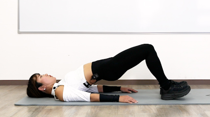 仰向けに寝て膝を立て、お尻を持ち上げる運動。腰・お尻の筋肉を強化できます。