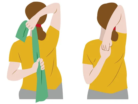 背中にタオルを回して行うストレッチ。拘縮期におすすめ。