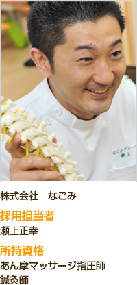 見学会で治療体験を受けた際、ずっと悩んでた腰痛がすこぶる改善しました。この技術を学びたいという思いと、ずっと悩んでいた腰痛が改善した感動を患者様に還元したいと思いなごみグループに入社を決めました。
