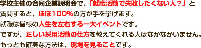 学校主催の合同企業説明会で、「就職活動で失敗したくない人?」と質問すると、ほぼ100%の方が手を挙げます。